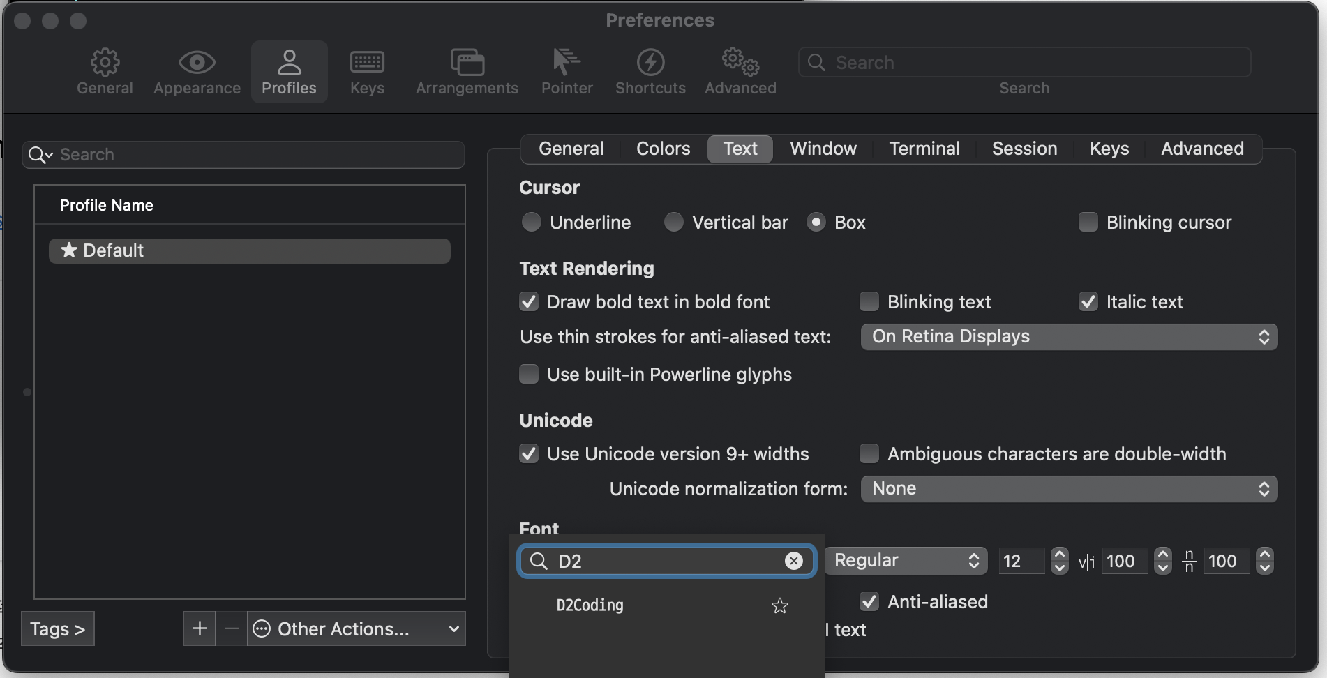 Iterm2 를 띄운 상태에서 상단바의 Iterm2 > Preferences > Profiles > Text > Font 에서 방금 설치한 D2를 선택,