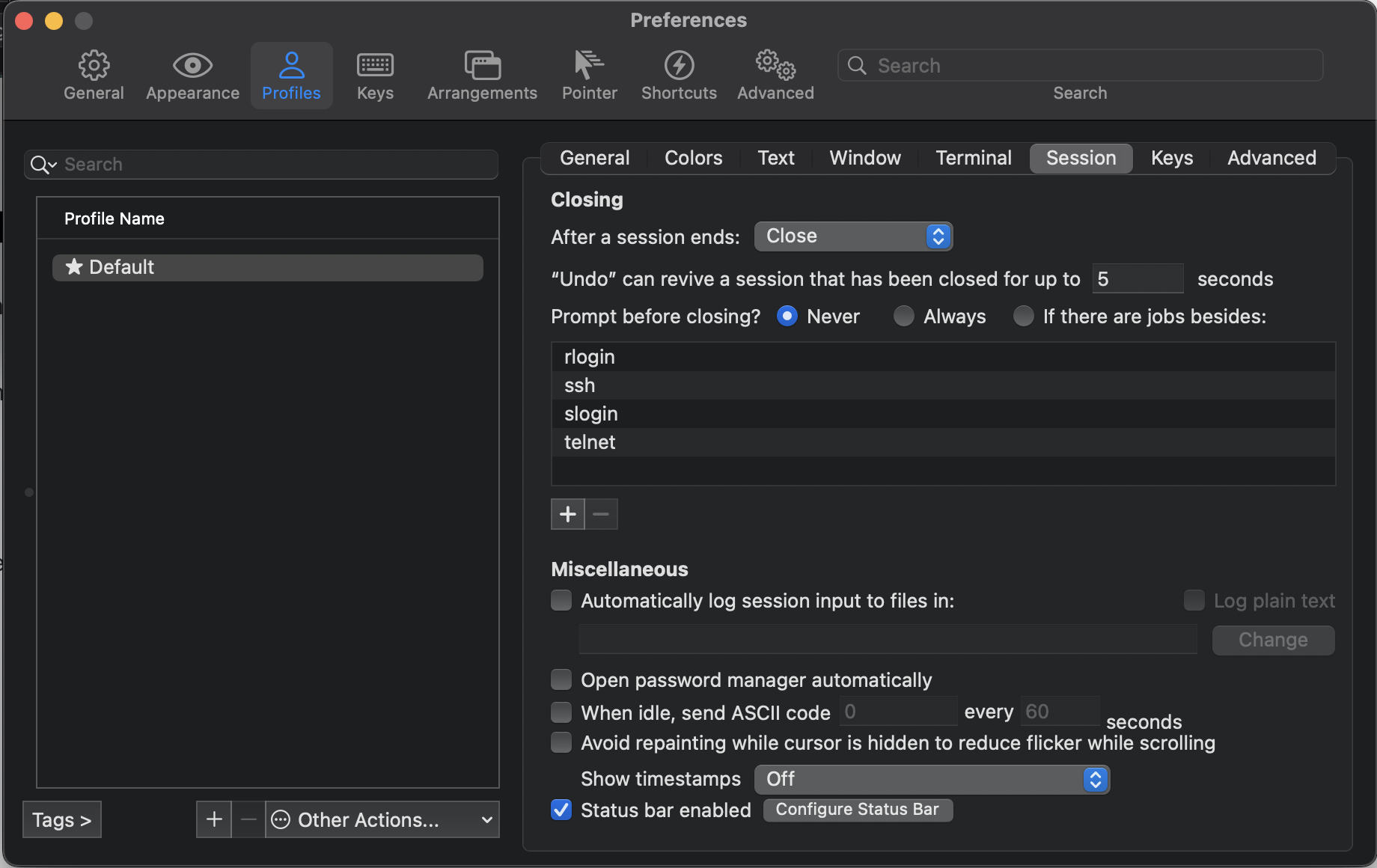 Iterm2 > Preferences > Profiles > Session > Status bar enabled 체크