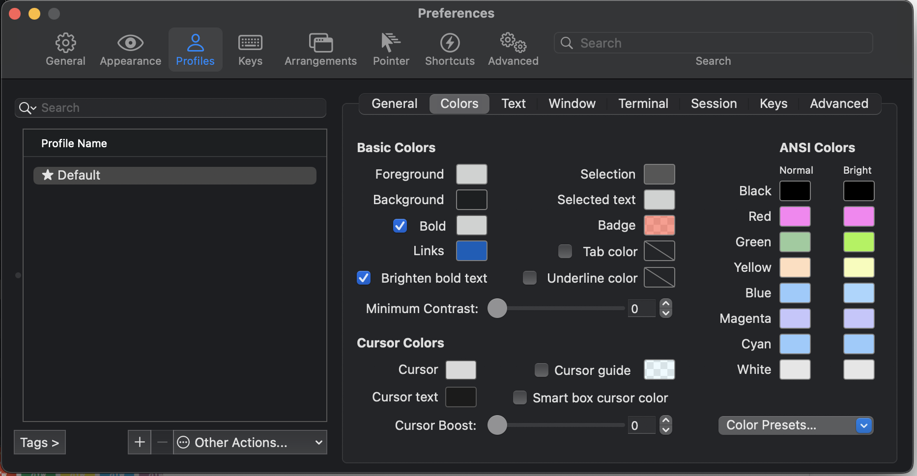 iterm2 > Preferences > Profile > Colors 우측 하단의 프리셋 선택에서 설치한 Color 를 적용한다.