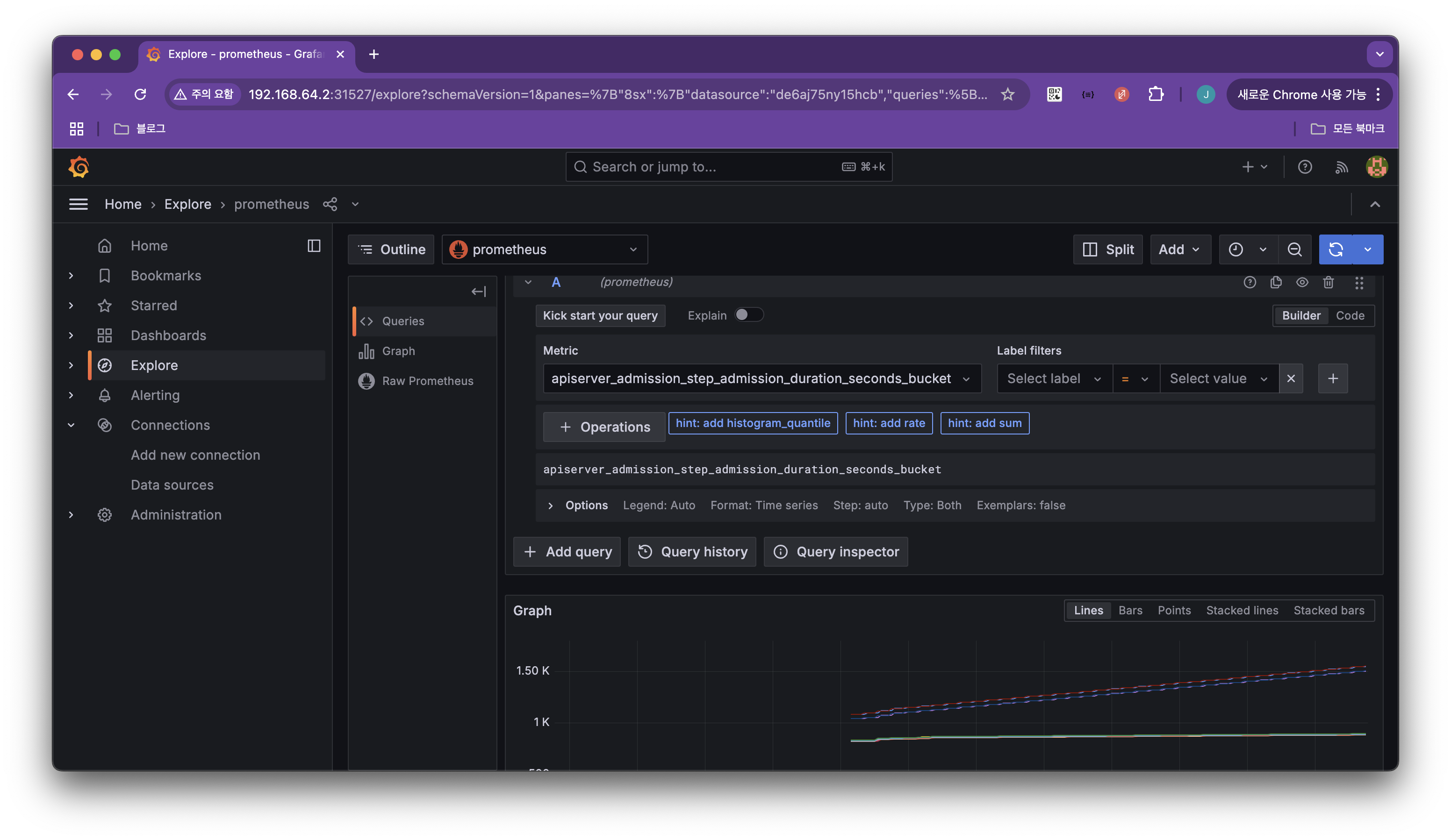 Explore -> prometheus 클릭 후 매트릭에 대한 query 를 수행하면 prometheus 가 수집한 정보가 표시됨.